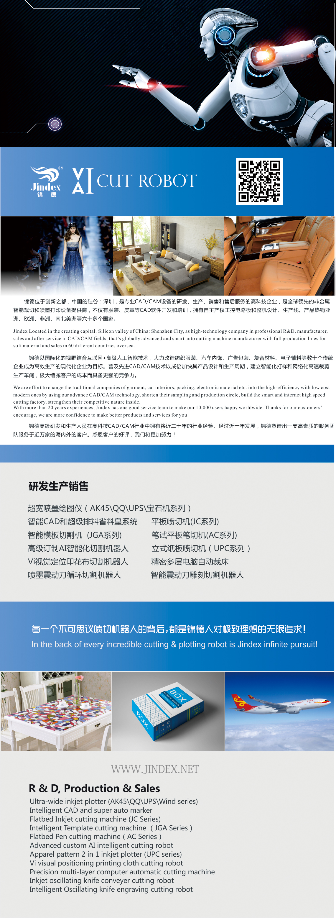 - All kinds of apparel fabrics, car seat, furniture sofa, shoe bags and other industries widely print marking, cutting and circular feed CCD after correction for the integration of intelligent high-end jet cutting robot, usually with two roll of paper, one for paper, one for material.
